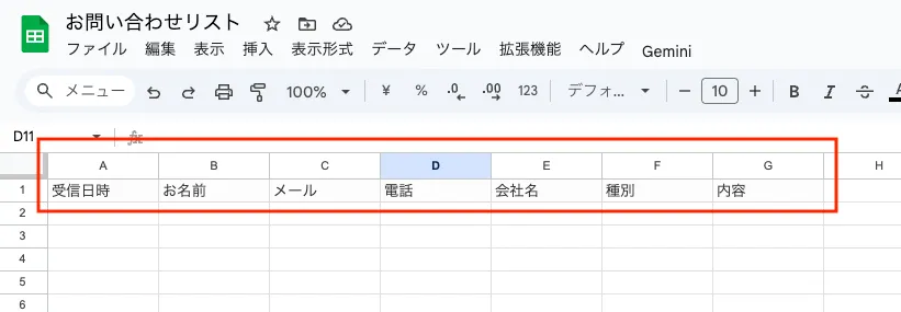- スプレッドシートのシート名は「お問い合わせ」になっているか